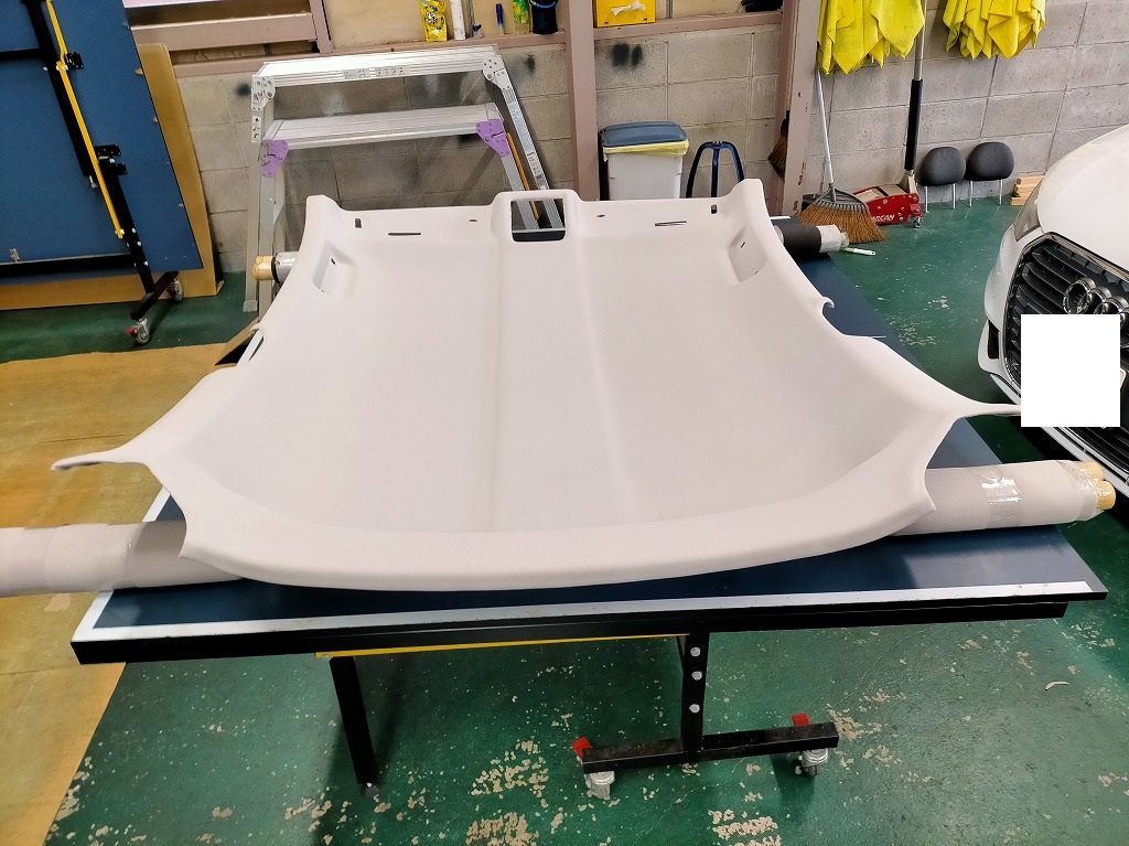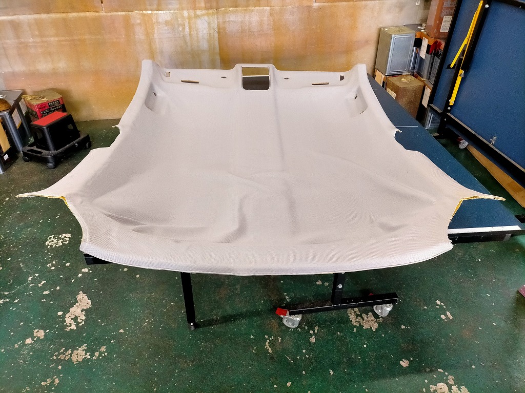 現在の天井生地とウレタンを剥がし、乾燥させて新しい天井生地を張ります。生地は類似色の天井専用生地使用。