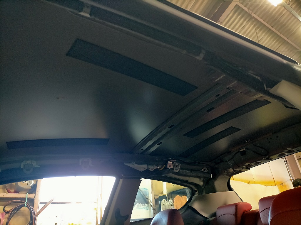 天井ライナーを外した状態で、ルーフパネルの鉄板が見えています。