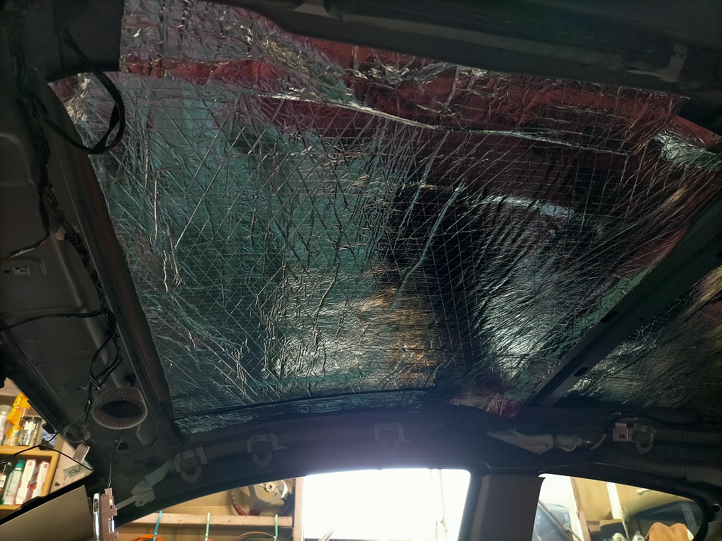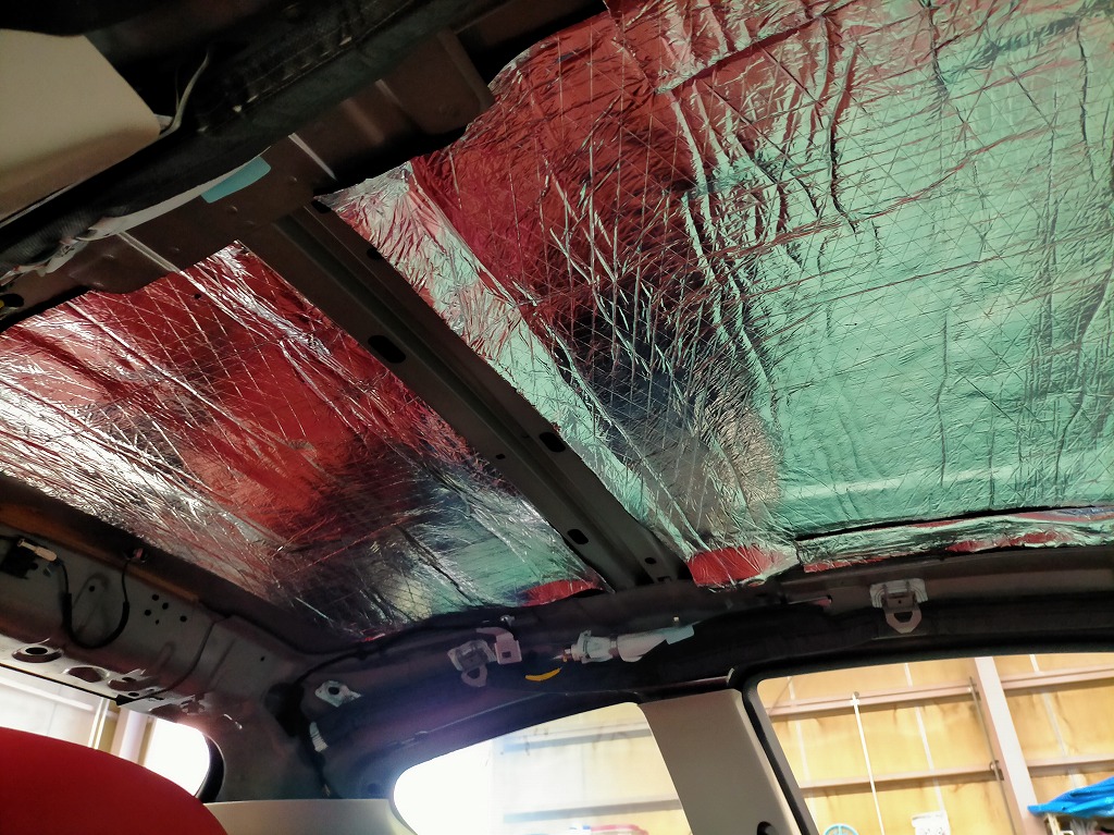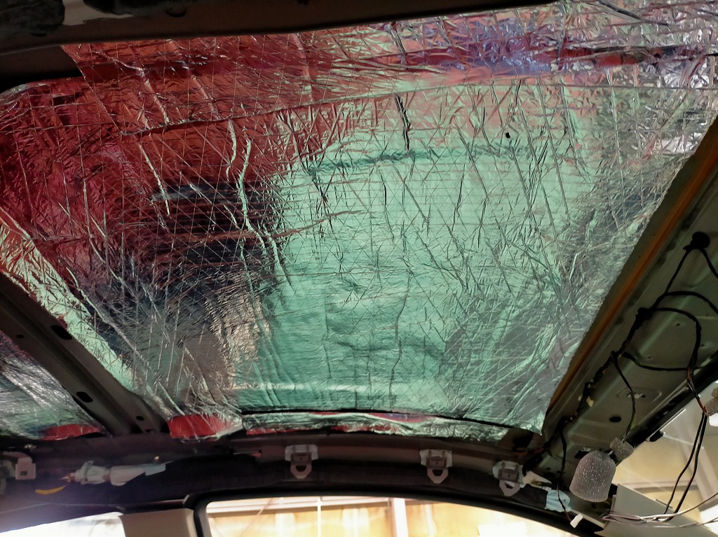 ルーフ全面に アルミ蒸着の断熱・遮音材 を貼り付けました。
