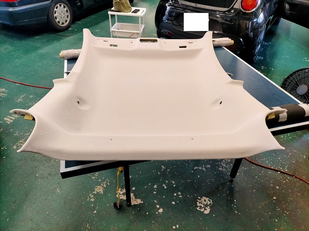 現在の天井生地とウレタンを剥がし、乾燥させて新しい天井生地を張ります。生地は類似色の天井専用生地使用。