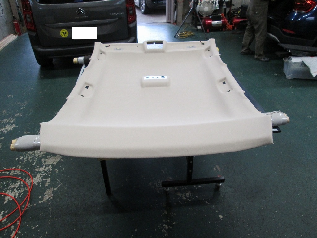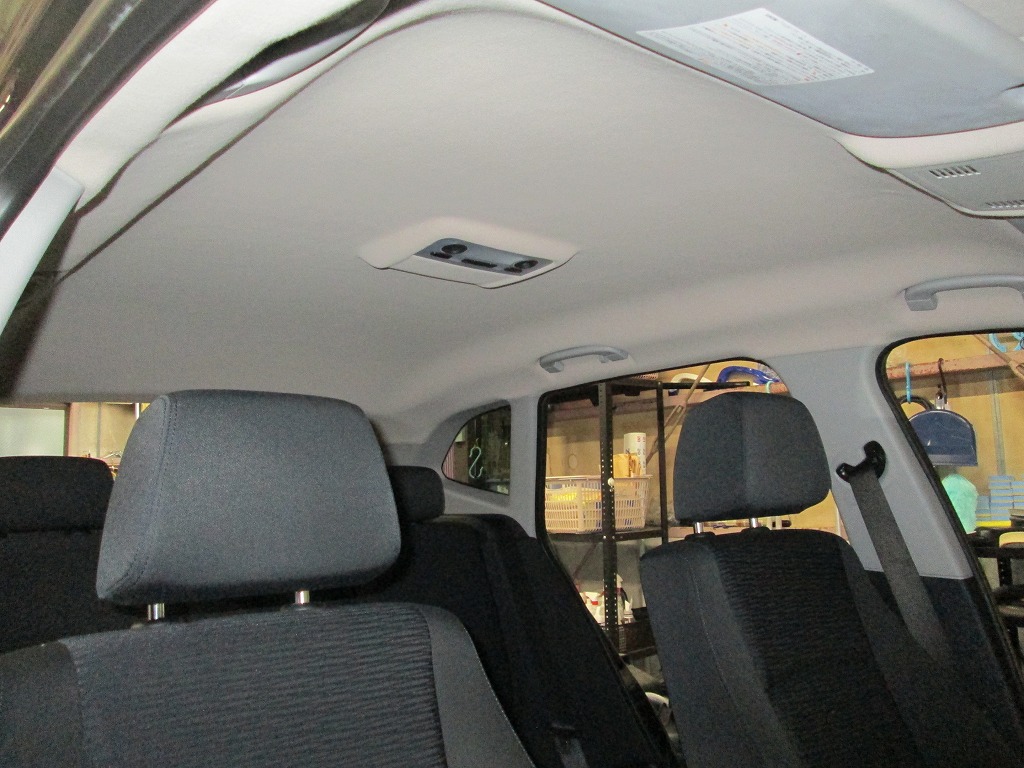 現在の天井生地とウレタンを剥がし、乾燥させて新しい天井生地を張ります。生地は類似色の天井専用生地使用。