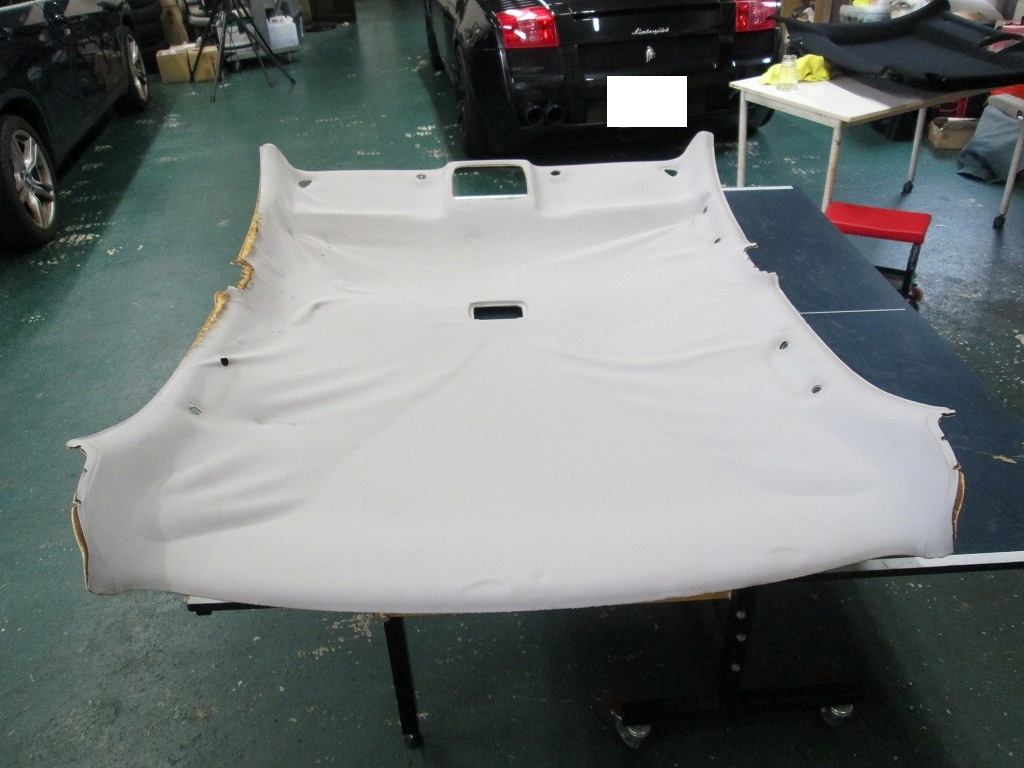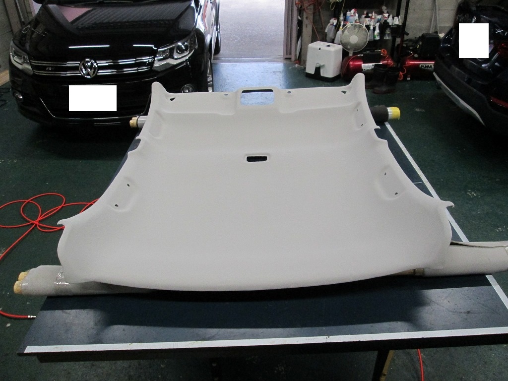 現在の天井生地とウレタンを剥がし、乾燥させて新しい天井生地を張ります。生地は類似色の天井専用生地使用。