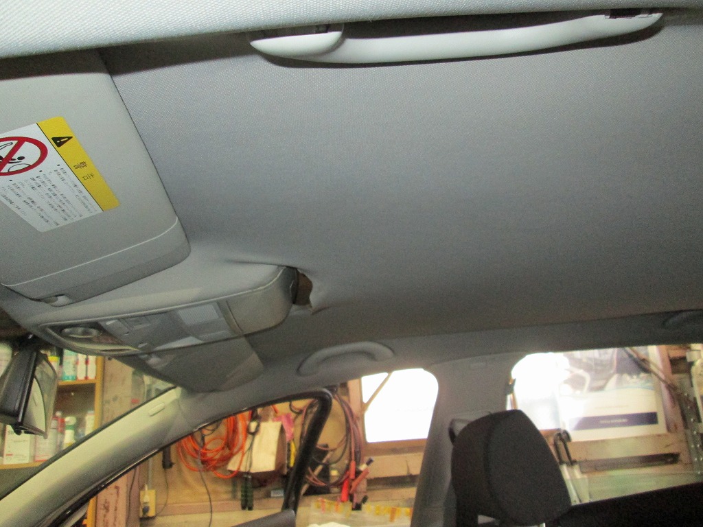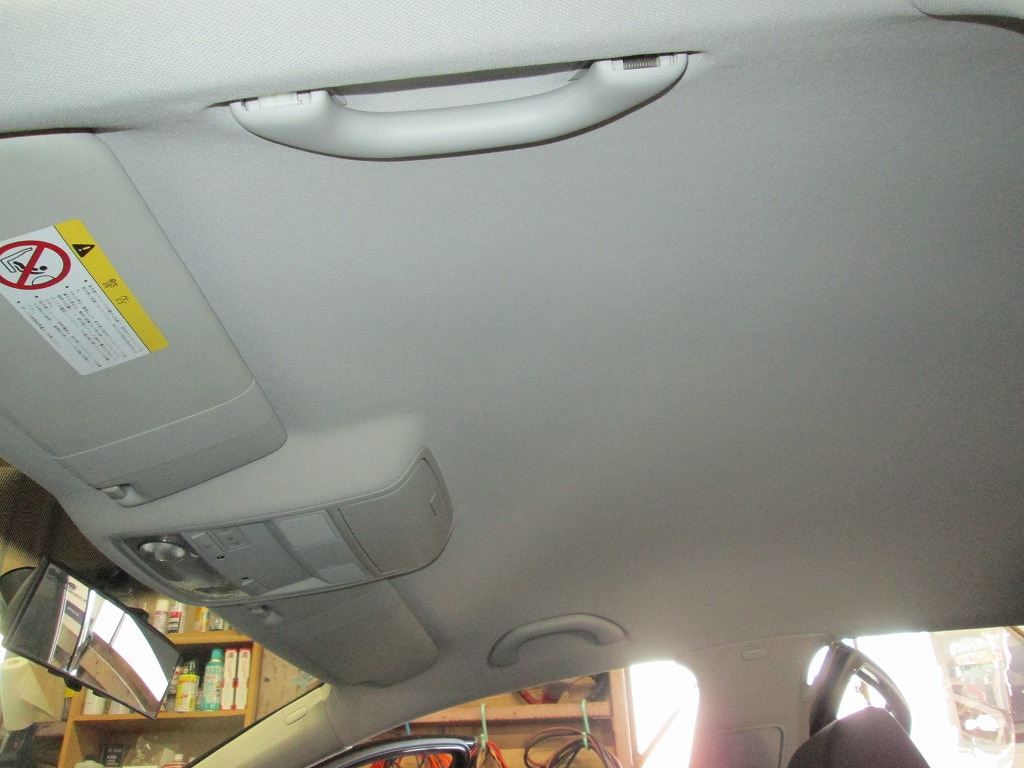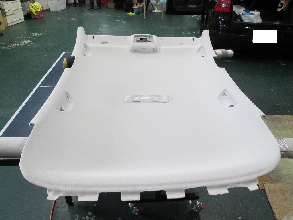 現在の天井生地とウレタンを剥がし、乾燥させて新しい天井生地を張ります。生地は類似色の天井専用生地使用。