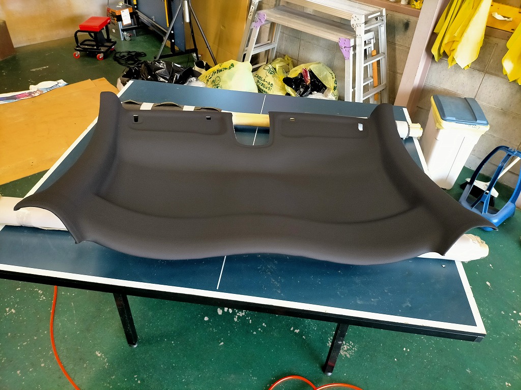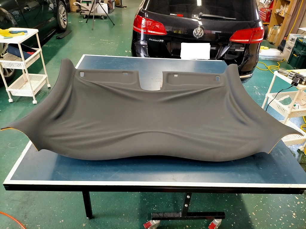 現在の天井生地とウレタンを剥がし、乾燥させて新しい天井生地を張ります。生地は類似色の天井専用生地使用。