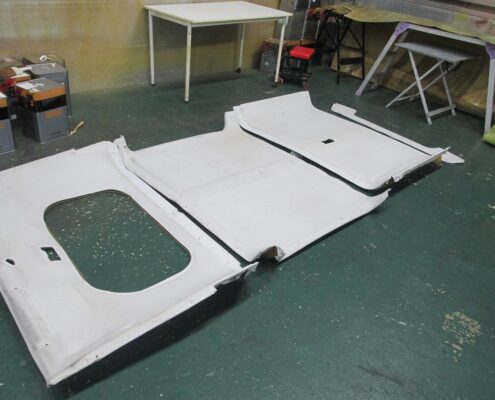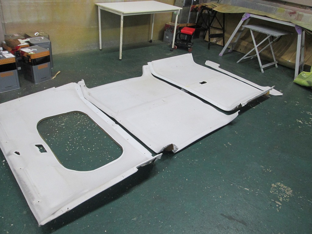 車内の養生をしてから天井を止めている部品などを外して天井のライナーを下に降ろして、車外に取り出します。ガラスを取り外す必要がある場合もあります(車種によって取り外しの方法や時間が違います)