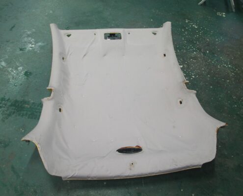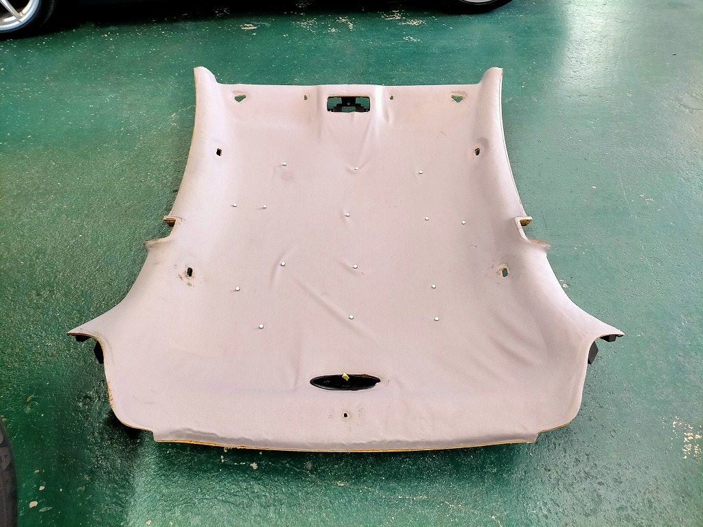 そこで当店では、「天井生地の張替え」によるリーズナブルな修復サービスをご提供しております。垂れてしまった天井生地と劣化したウレタン層を丁寧に剥がし、十分な乾燥処理を行ったうえで、GT の内装に調和する天井専用の類似色生地を用いて張替えを行います。