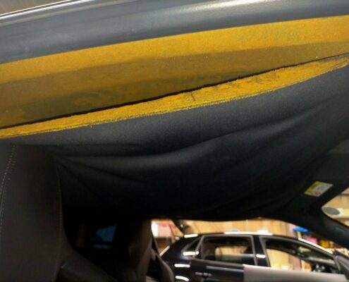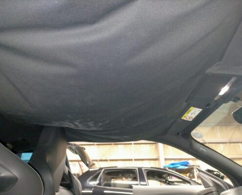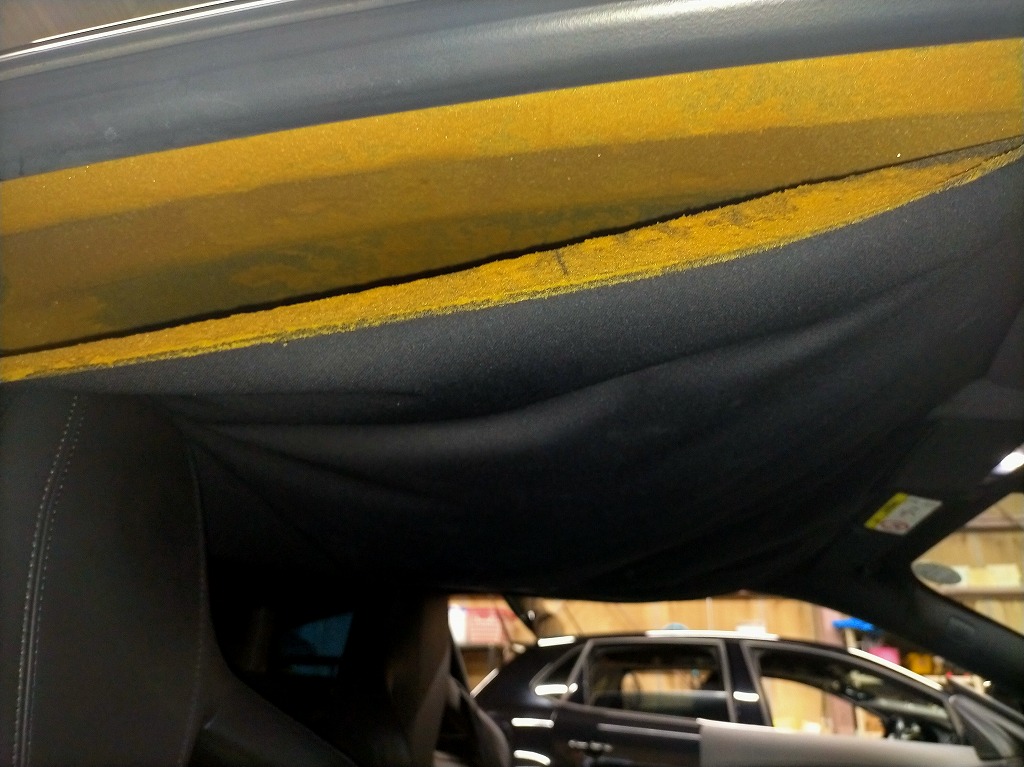 車内を丁寧に養生したうえで、サンバイザー・ルームランプ・ピラー部品などを順に取り外し、天井ライナーを車外へ取り出します。Fタイプはルーフが低く作業スペースが限られるため、特に慎重に作業を行います。