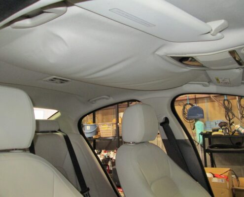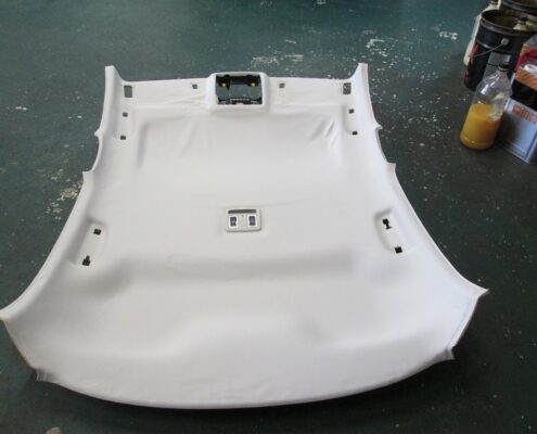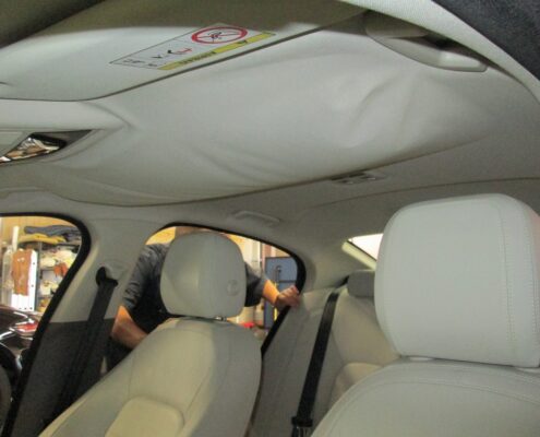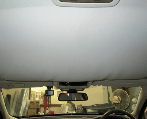 車両から取り外した時と逆の順番に複数の人間で確認し合いながら慎重に天井ライナーの取り付けをします。取り付け後にルームランプなどの点灯確認を中心に点検をして正常であれば完成です。